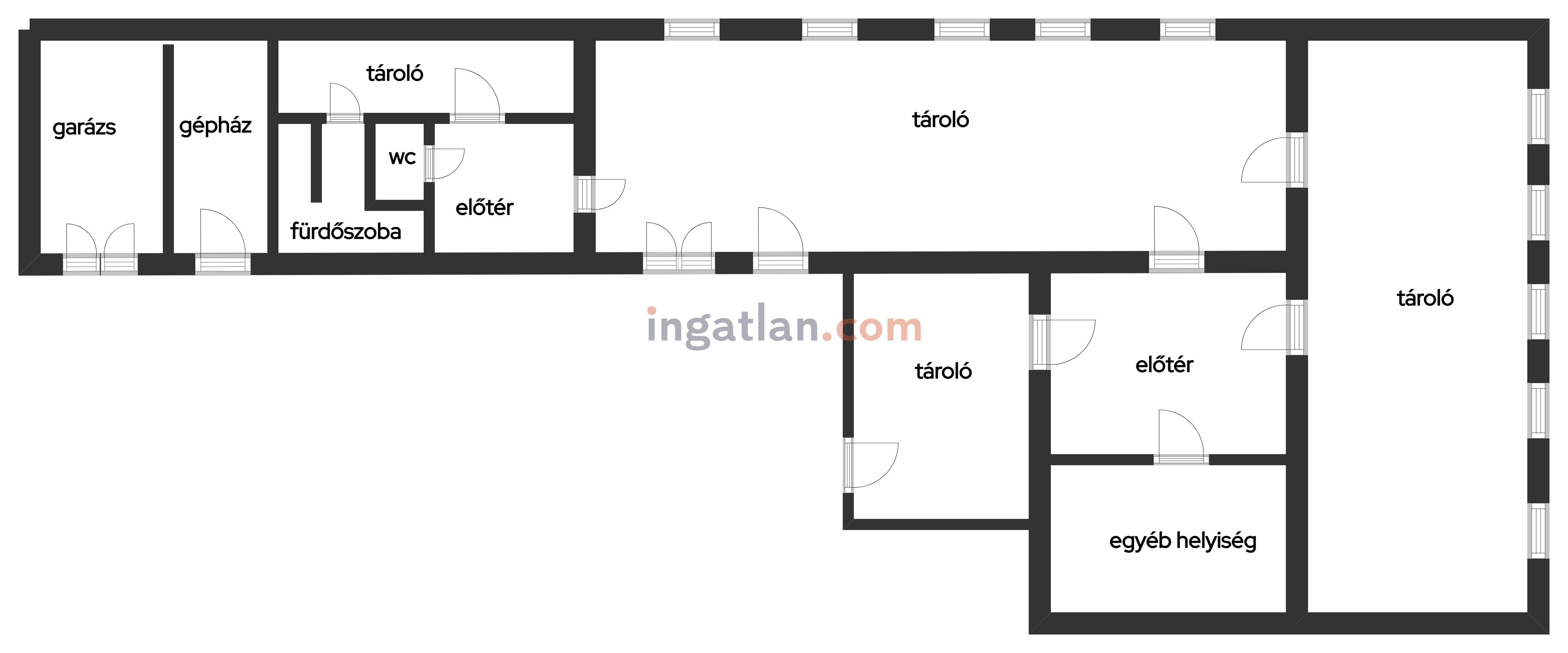 Egy szinten, L alakban elhelyezkedő épület, udvari bejárattal. 2 nagyobb-, és 2 kisebb helyiség, fürdőszoba-wc és az előtér, hozzá építve egy mobil (fémvázas)raktár. A mobil épület garázsnak is alkalmas.
